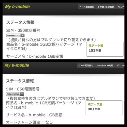 データ通信量はb-mobileのサイトで確認が可能で、12/10に使用開始して、12/27に確認したところ。。。アタシは残り153MB、KYKは残り981GB。これで、アタシは月に1GBを超える事が予想され、KYKには1GBは必要ない事が分かります。