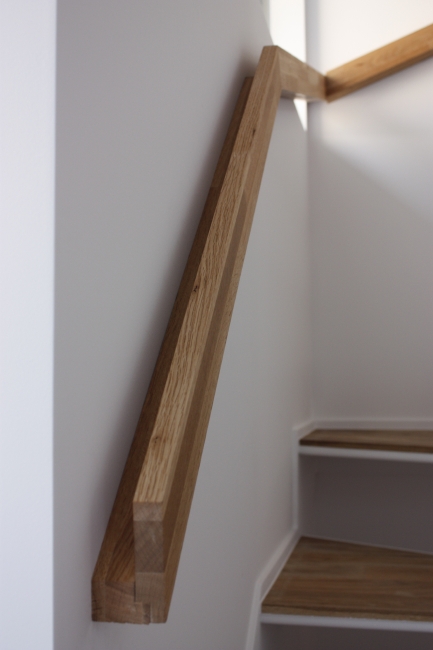 木材だけでなく、白い土台を入れることで薄い木材が使え、とってもスッキリした階段です。